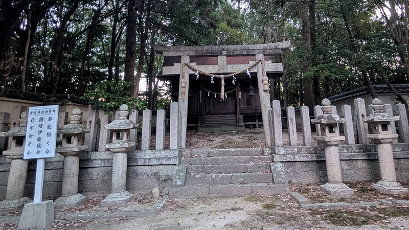 そして、この物語の舞台はどこか?ここ讃岐神社と言われている。ご祭神 散吉大建命(さぬきおおたけるのみこと)など。現在は、若蔵稲乃命(わかうかのみこと)、讃岐伊能城命(いのしろのみこと)、大国魂命、大物主命の4柱。