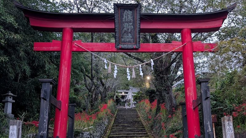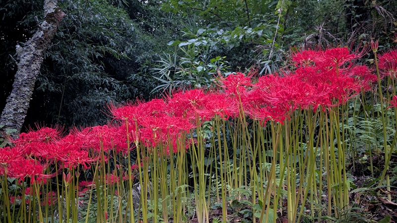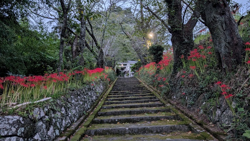 苔むす石段の脇に彼岸花。この景色は壮観。