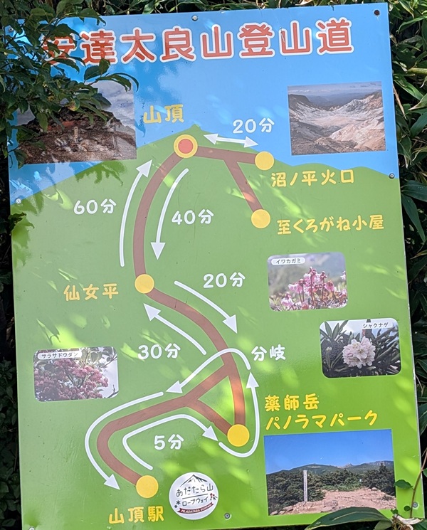 下り 75分 安達太良山 10時20分 仙女平分岐 10時25分 薬師岳分岐 11時32分 山頂駅 11時35分