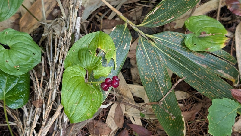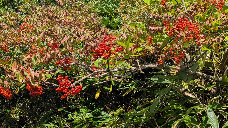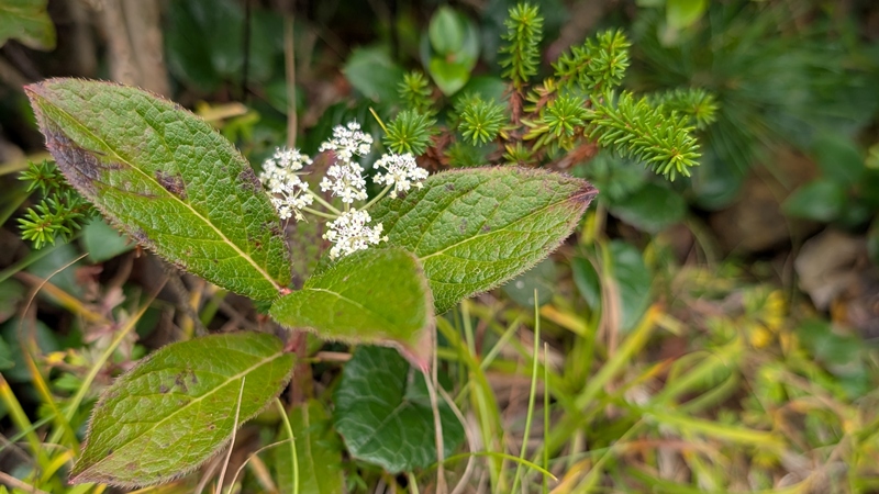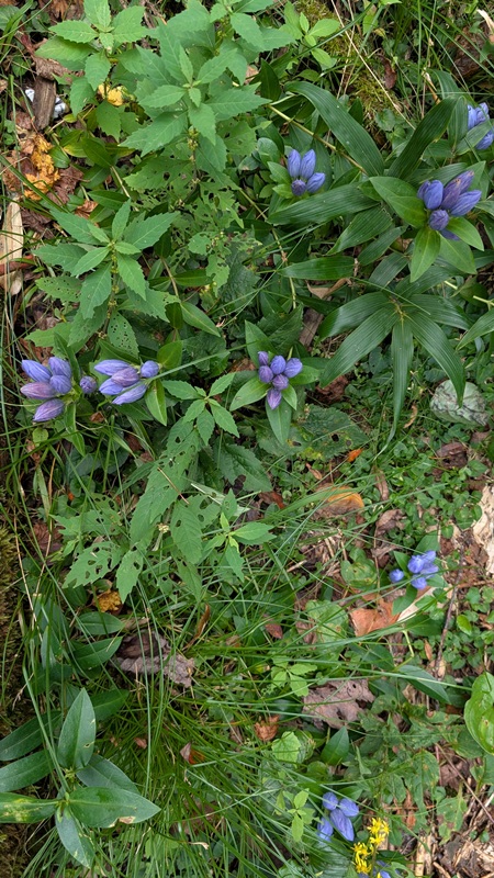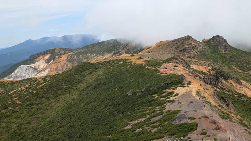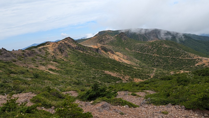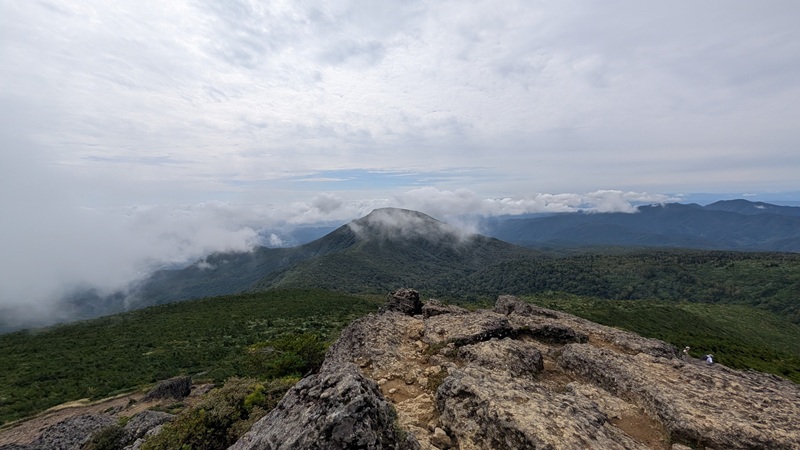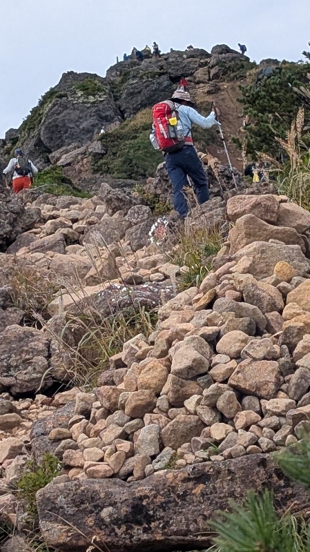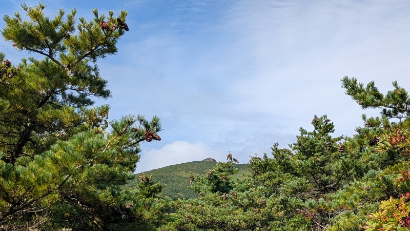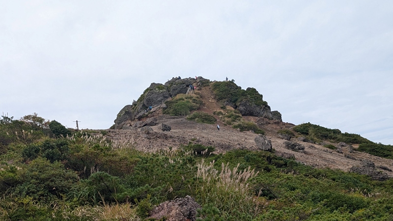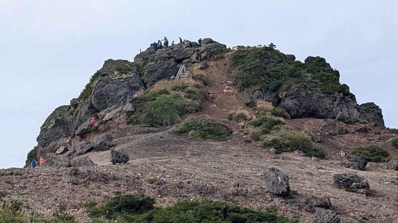 最初は樹林帯の木道でゆるやかでところどころぬかるみがある。山頂部が時々、顔を出す。登山道らしくなり、「馬の背」の手前15分が角度があがって急になる。ゆっくり登って仙女平に到達。ここから、溶岩ドームの山頂へ右から巻く。梯子や鎖を使って登頂。下りは、梯子を使って。紅葉の時期はまだで、高山植物が残っていて、楽しませてくれた。