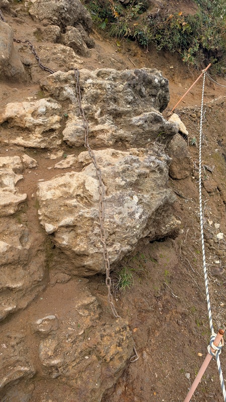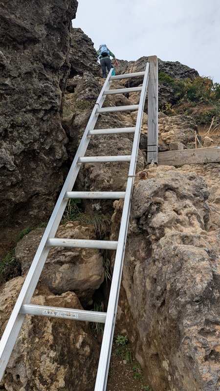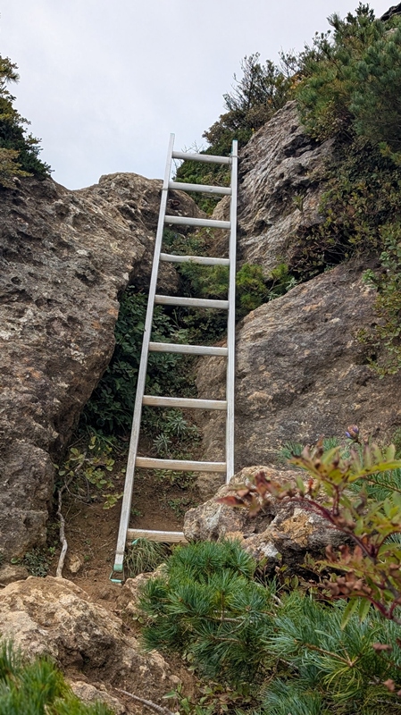 山頂へは梯子が2か所あるが、右に巻いていく道もある。往きは右の梯子と鎖、帰りは左の梯子を使うらしい。2018年に取り換えられたもの。登山道整備に感謝。