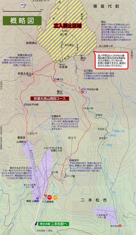 馬の背から牛の背方面の矢筈森に行けるが、沼ノ平の爆裂火口の近くは火山ガスが発生しているので注意。1997年(平成9年)、火山ガスで4名の死亡事故が起きていて、立入禁止区域や通行禁止となっている。で、ピストンが無難だが、周回だと「峰ノ辻」経由ーくろがね小屋ー勢至平ー山麓駅《ロープウェイ使わない道》で下山する。