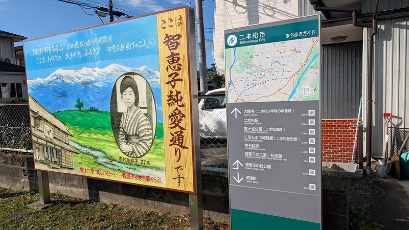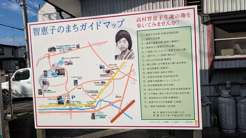 二本松市智恵子記念館という。高村 智恵子(たかむら ちえこ、1886年(明治19年)5月20日 – 1938年(昭和13年)10月5日、旧姓:長沼)は、日本の洋画家、紙絵作家。夫は彫刻家・詩人の高村光太郎。彼女の死後に光太郎が出版した詩集『智恵子抄』でも知られる。智恵子は柳八重の紹介で光太郎と出会った。創作に悩んでいた時、紙絵の創作をすすめられた。1912年(明治45年)4月、太平洋画会展に2点の油絵を出品し、6月には団扇絵展を開催。1913年(大正2年)9月、上高地に行く光太郎を追い、一緒に絵を描いた。翌年、光太郎と同棲をはじめた。活動の拠点は東京だが望郷の念は福島にあった。。1929年、実家が破産し精神的に病むようになる。1932年、自殺を図る。1935年(昭和10年)、南品川の精神病院「ゼームス坂病院」へ入院した。創作力を取り戻し、紙絵の作品を多く制作。1938年、肺結核で亡くなった。ゼームス坂病院跡地に慰霊碑「レモン哀歌の碑」がある。