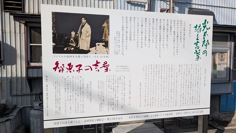 光太郎と鞍石山(智恵子の杜公園)を歩き、そこから安達太良山を見た。1992年、酒蔵であった高村智恵子の生家が再現、裏庭に智恵子記念館が開設。記念館には彼女の油絵、紙絵が展示されている。