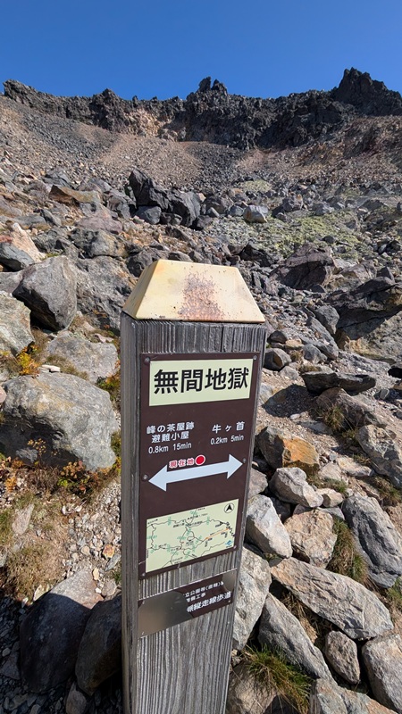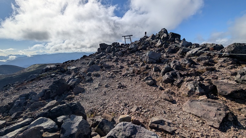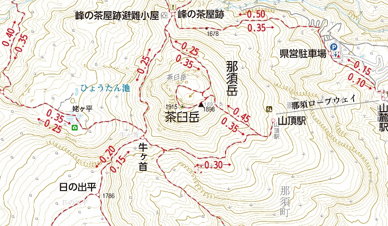 山麓駅 10時50分 山頂駅(1684m)10時54分 分岐 11時1分 牛ヶ首(1735m)11時26分 日の出平(1783m)11時46分 牛ヶ首 12時3分 無間地獄 12時12分 硫黄鉱山跡 12時27分 峰の茶屋(1678m) 12時30分 お鉢巡り 13時39分 茶臼岳山頂(神社の祠) 13時46分 大岩 14時14分 分岐 14時36分 山頂駅 14時43分 山麓駅 14時54分