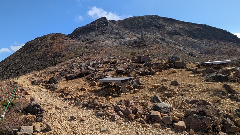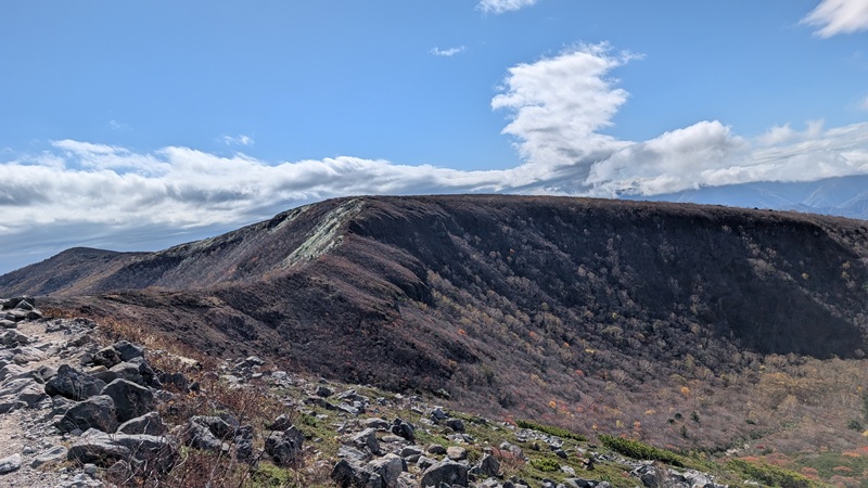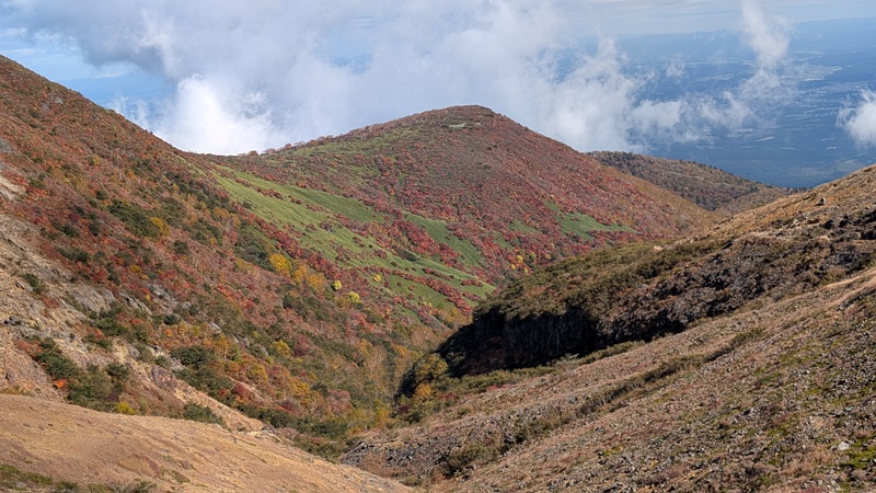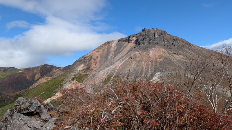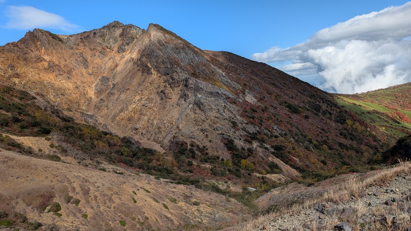 牛ヶ首で猛烈な風。日の出平方面から眼下の姥ヶ平とひょうたん池の紅葉が素晴らしい。それと那須岳の堂々たる山容がどこまでも。そして、牛ヶ首から周回。噴煙をあげているところは、無間地獄。その後、峰の茶屋へ。朝日岳と三本槍岳の雄々しい峰に感動。さらに、右の山の紅葉がきれい。1678m地点までいったが、戻る。鉱山跡から山頂を目指す。溶岩ドームへは、なかなかの急坂のガレ場。火口は荒々しくなく砂礫。山頂は、鳥居と祠があり、標柱や三角点もある。眺望が見事だった。山頂から山頂駅までは急な下り。大岩あたりがポイント。