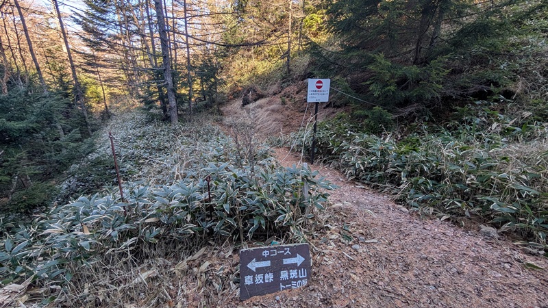周回ルートは、Jバンドから降りて、賽の河原へ。湯の平まで「落葉松の森」を満喫し、草すべりの急登で、トーミの頭へ。
