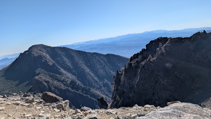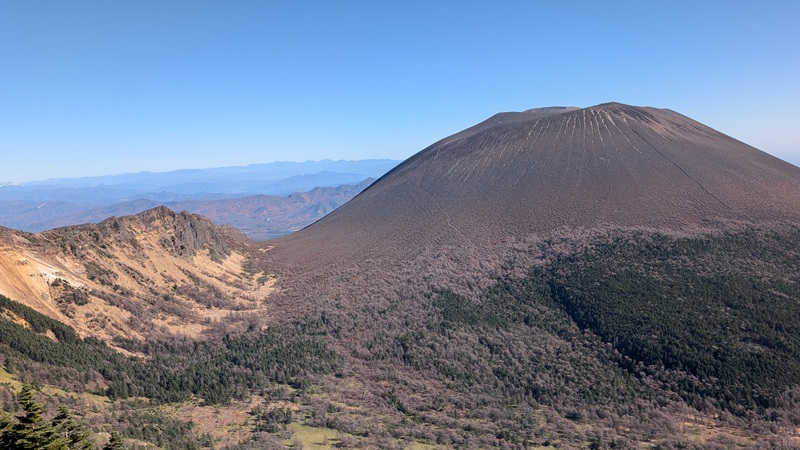 「トーミの頭」浅間山が。稜線沿いに歩くと、第一外輪山の最高地点、黒斑山(2404m)、その先の蛇骨岳(2366m)。ずっと、浅間山の山容がみえる。