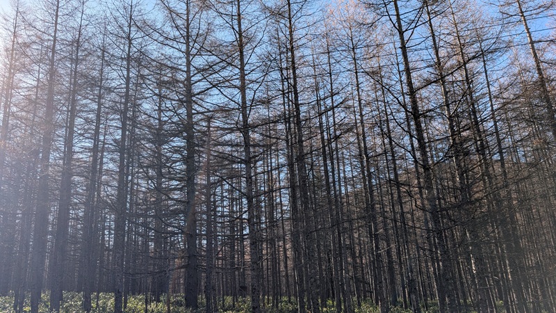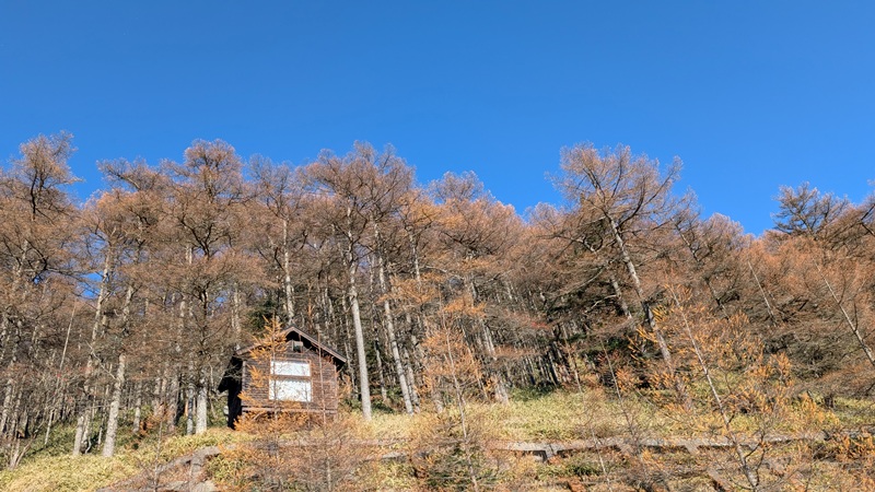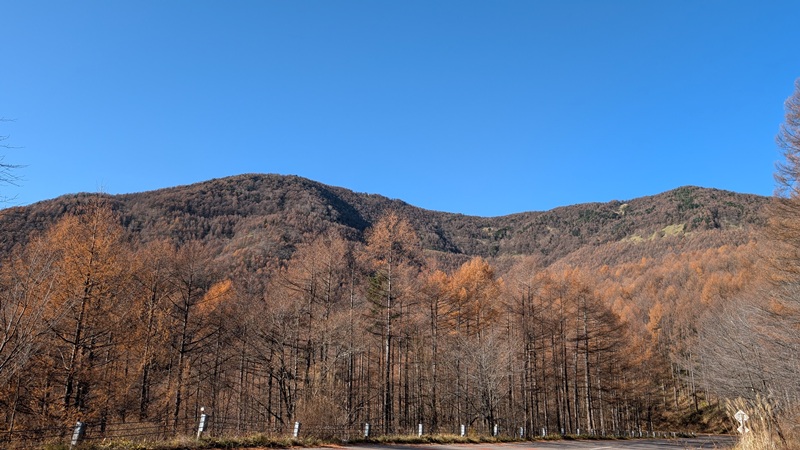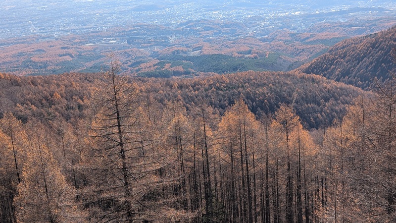 落葉松の紅葉は素晴らしく、この時期にしか見られない風景。霧氷があらわれ、ガトーショコラの浅間山がもうすぐ。