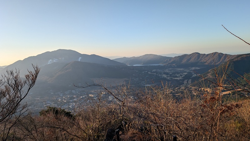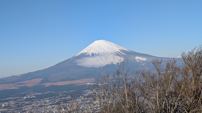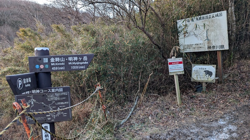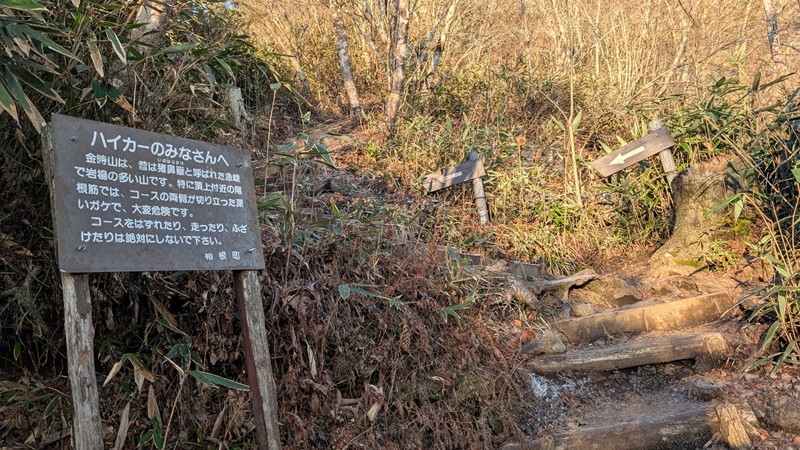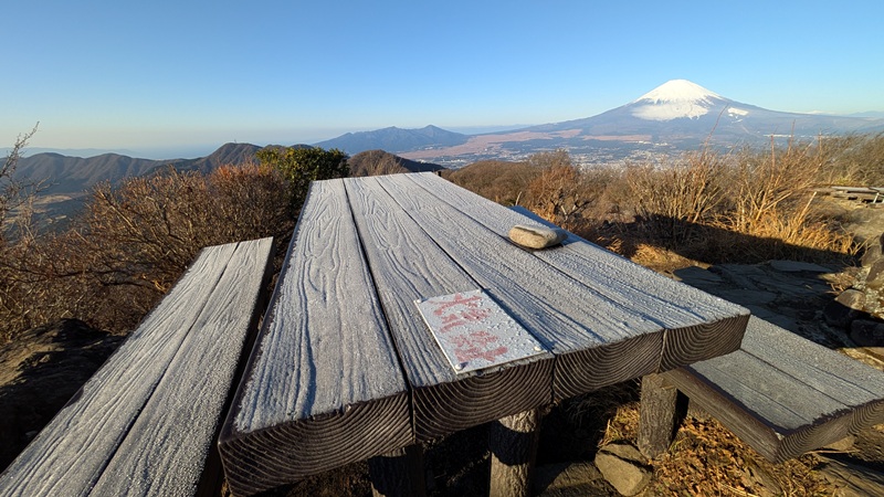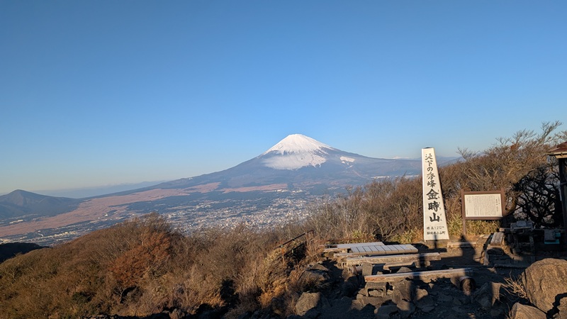 5つくらいの登山口があり、どれも登りやすい。縦走など、箱根の人気コースの一つ。登山口の美晴パーキングは車が30台くらいあった。標高849mからスタート。標高差400mで登山者は10名ほどと会った。登山口にトイレはない。箱根入口にセブンイレブンがあり、朝食を買ってトイレもすませておいた。前から気になっていたが人気の金時山に登れてよかった。防寒対策は行う事。地面は凍結しているところがある。頂上のテーブルが凍っていた。ニット帽子が役立った。手がかじかむ。おそらく寒気が入れば、積雪があってもおかしくない。軽アイゼンが必要かもしれない。
