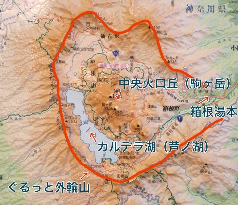 箱根町、足柄市、湯河原町の山域で芦ノ湖も含む広い山域。箱根というと、箱根駅伝、関所、そして大涌谷の黒たまご。箱根宮などがある。2025年、「ちきゅうの谷」がオープン。
