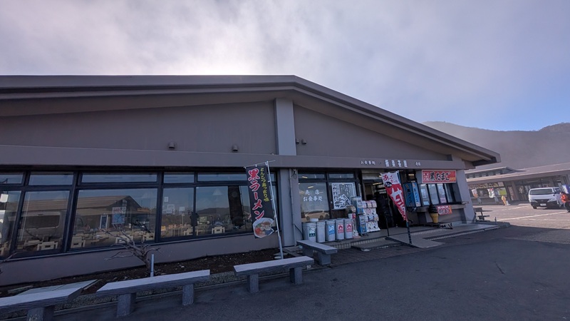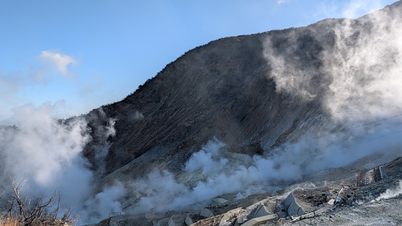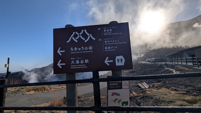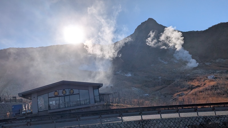 標高1042m 気温-3℃ 冷たい風 厳しい自然。大涌谷の黒いモニュメントは映えスポットで、なかなか撮れなかった。観光客は韓国が多いかな。賑わっていた。黒ラーメンもある。