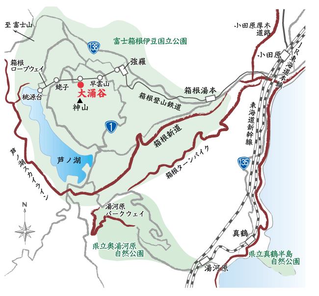このあたりを箱根山と言うが、一つの山でなく多くの峰からなる。神山、冠ヶ岳、駒ヶ岳、早雲山、金時山、明神ヶ岳などもそう。神山の北に「大涌谷園地」があり、「大涌谷自然研究路」が整備されている。2015年5月6日、活動が活発化し、気象庁は噴火警戒レベルを1(当時呼称、平常。現、活火山であることに留意)から2(火口周辺規制)に引上げ。更に6月30日には、ごく小規模な噴火が起きたとして、噴火警戒レベルを3(入山規制)に引き上げ、箱根町は大涌谷周辺半径1kmに避難指示を出した。その後、11月20日には噴火警戒レベルが1に引き下げられ継続中である。黄緑色の硫黄が生々しい。その硫黄には使い道がある。江戸時代には、火縄銃などに。最近は、火薬や花火に加工されている。火山ガスが微量ながら出ているので、呼吸器官の疾患のある方や、ぜんそく気味の方は注意が必要。