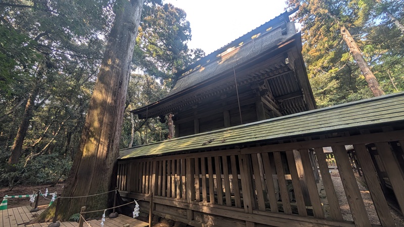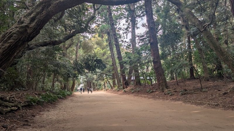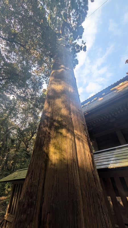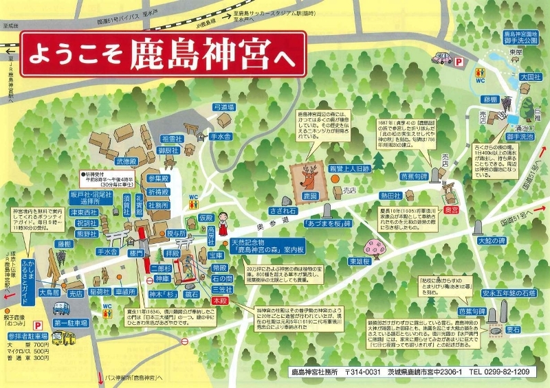 鹿島神宮樹叢 神宮境内には、神宮の長い歴史とともに生育してきた巨木名木が多い。樹叢は、高木層はモミ・スギ・シイ・タブノキ・クスノキ・カシ類など、低木層はヒサカキ・モチノキ・シロダモ・モッコク・アオキ・アリドウシなど、草木層はブミョウガ・オカメザサ・シダ類など。本殿の裏にはスギの神木があり、樹高約43m、根周囲12mの巨木で、樹齢約1000年といわれています。要石周辺は、モミの純林とオカメザサの群生が。御手洗池周辺はカヤ・モミ・スジダイ・タブノキの樹高20mの林が見られます。