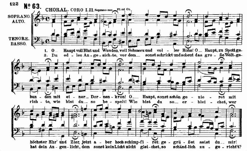 特に印象に残る曲は、マタイ受難曲とヨハネ受難曲のアリアだが。その主たるものはコラールで、バッハは古来で使われていた1601年ハスラーの短い一節を親しみやすく印象深くするテーマであるコラールとして節目に5度、登場させた。それらは調を変えているが歌詞も変わり例えば第63曲のO Haupt voll Blut und Wunden「おお、血潮したたる」という重要な場面で使用された。現在は、「おお、血と涙にまみれた御頭」讃美歌としても使用されている。